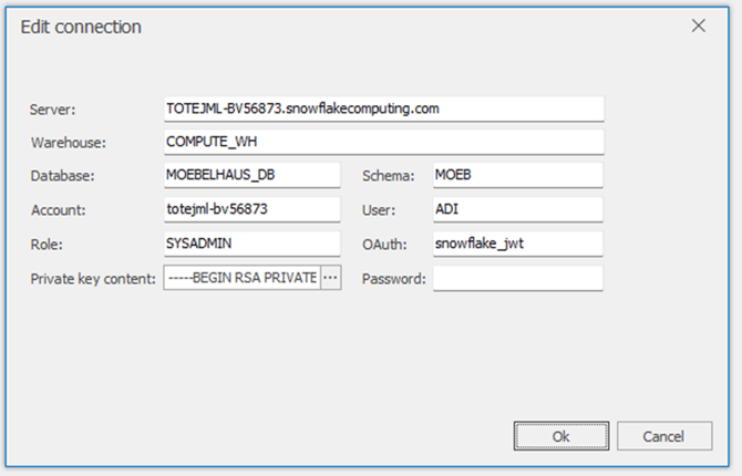 Tipp! Unter dem Reiter "Private key content" kann die erzeugte "rsa_key.p8" ausgewählt werden - hier wird nun das zuvor vergebene PW benötigt.