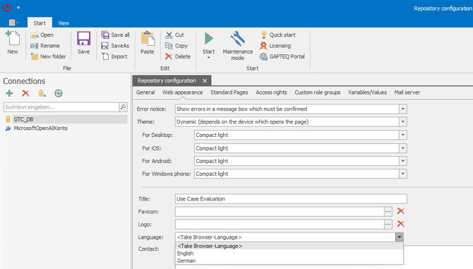 In den Repository Configurations im GAPTEQ-Designer stehen unter dem Reiter "Web appearance" und "Language" die Optionen zur Verfügung:-